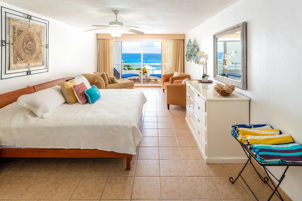 It’s a one-bedroom apartment with cozy and modern decor. Guest love their breakfast on the private ocean front balcony and the swimming pool, or jump into the sea at walking distance.