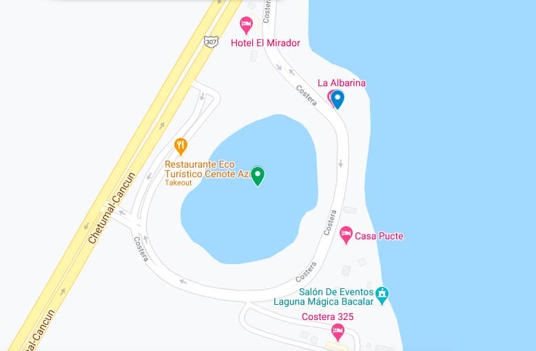 The Cenote Azul Bacalar is located at the very end of town. You can access it either from the coastal road or the main road.
