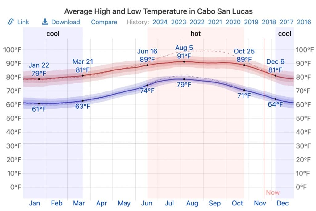 Cabo San Lucas and Baja California experience dry, desert-like weather with hot days and cool evenings. During winter, evenings can drop to 60°F (16°C), so pack a jacket if you travel in the winter months. You can also take a look at my post on the best time to travel to Cabo for a better understanding.