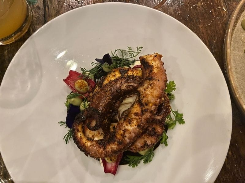 The menu here is quite creative, with both meat and vegetarian options available. If you go for wood-fired fish, you can watch them being cooked right before they’re served.